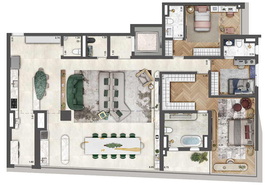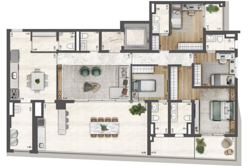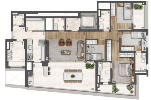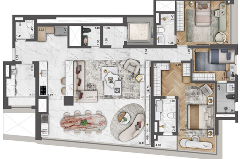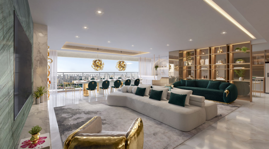As unidades oferecem plantas amplas de 162 m² e 198 m², com opções de três a quatro suítes, hall privativo, suítes master com banheira e espaço para home office, além de vagas de garagem generosas. Os ambientes foram pensados para garantir conforto, privacidade e uma atmosfera refinada, refletindo o estilo de vida urbano com alto nível de personalização e acabamentos premium.